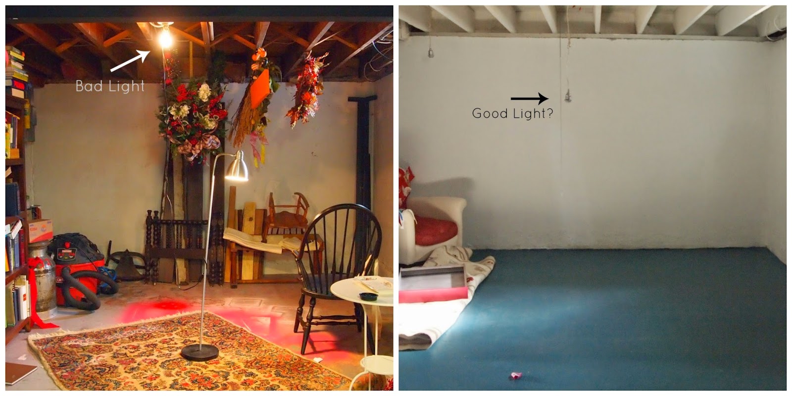 So once I had the space cleaned out, and the paint was down, I started to play around with my lighting scheme. The space only had one sad little lightbulb hanging and the plan was to center a new light over the desk as well as add some other lights around the space and a few outlets for plugs, lamps (more lighting) etc.