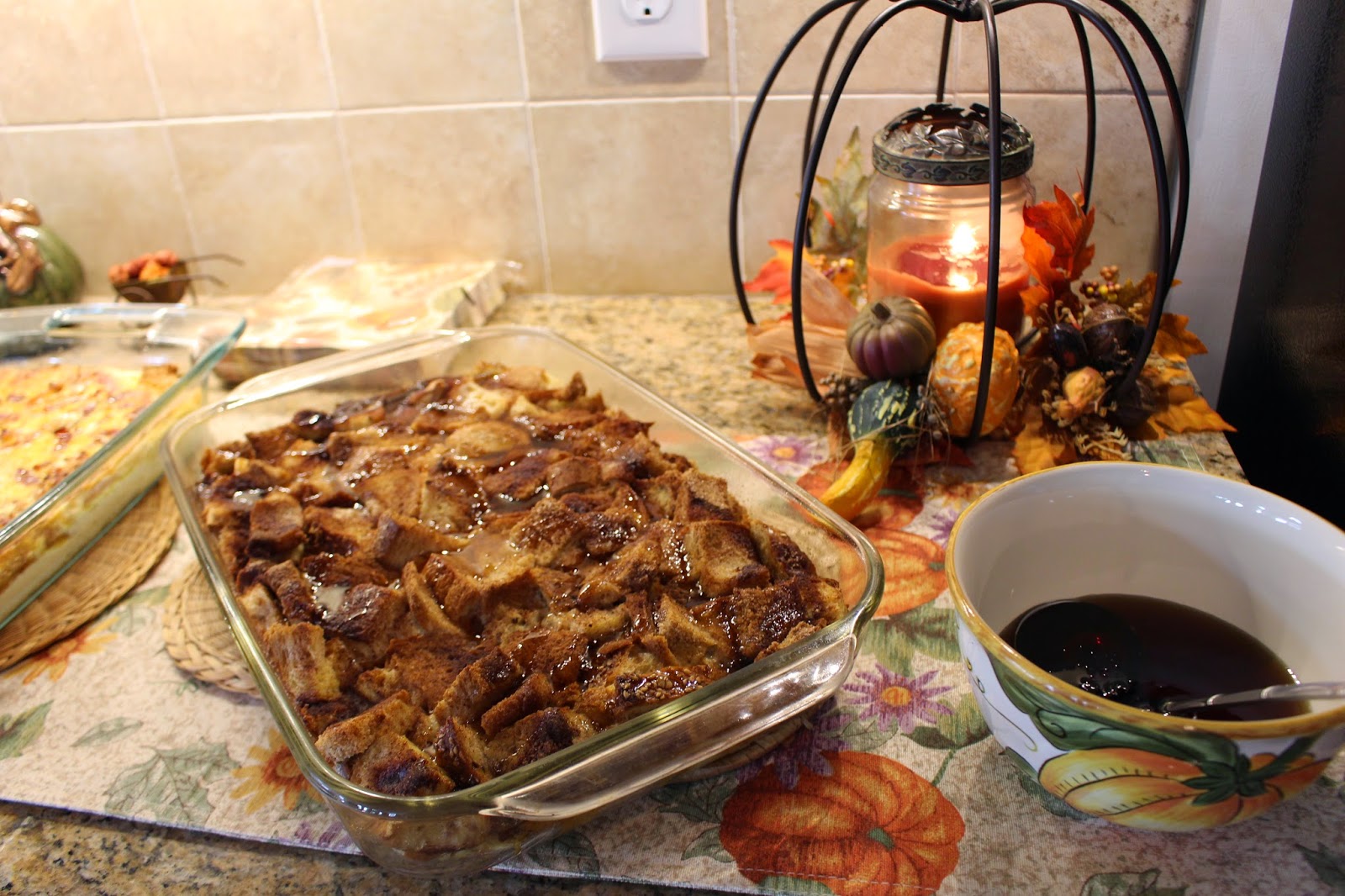 French toast casserole (oh honey!), with maple syrup for drizzling over it.